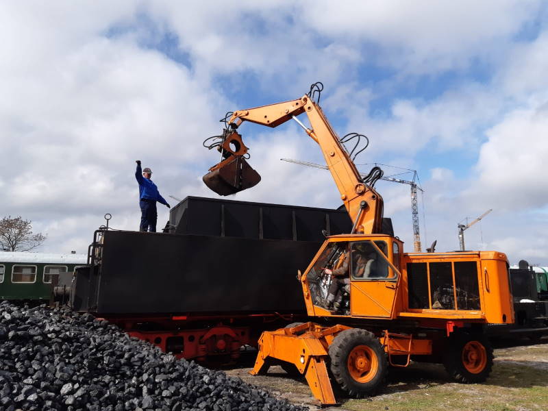 Die Osterfeiertage nutzten einige Aktive, um den Tender der Dampflok 50 3570 weiter zu pflegen. Mit unserem Bagger wurden zunächst die Kohlen entladen.