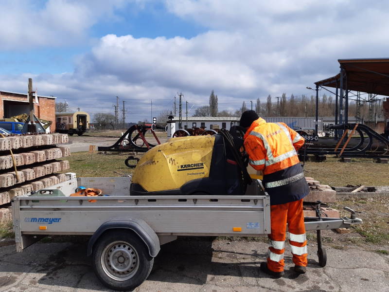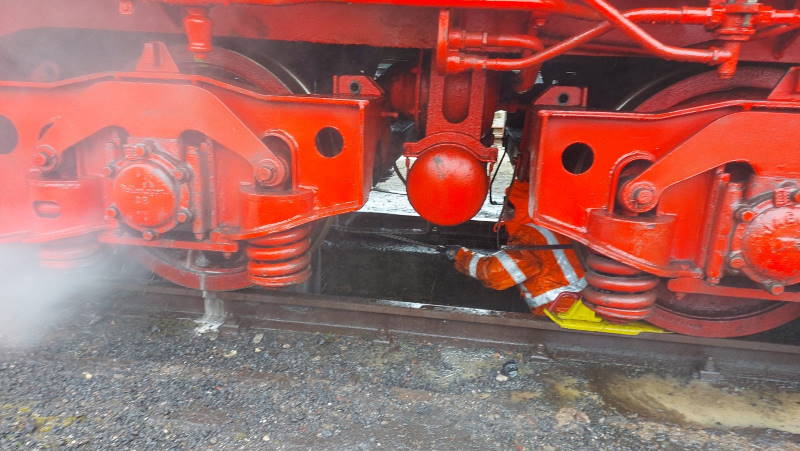 Mittels Hochdruckreiniger wurde der Tender von allen Seiten gereinigt, um ihn auf bisher verborgene Schäden untersuchen zu können. Zum Glück gab es keine entsprechenden Befunde.
