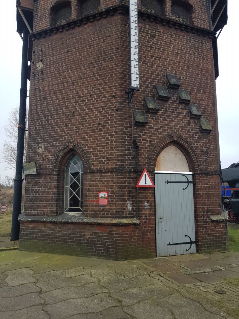 Auch am Wasserturm sind Fortschritte zu erkennen. So wurden die Fenster im Erdgeschoss freigelegt, die Fensterrahmen neu gestrichen und anschließend verglast. Auch der Fensterrahmen über der Tür wurde inzwischen eingepasst. Er ist aber noch von einem Holzbrett verdeckt, weil das Glas erst im Laufe der nächsten Woche eingesetzt werden soll.