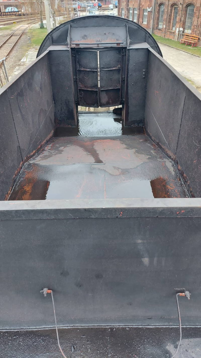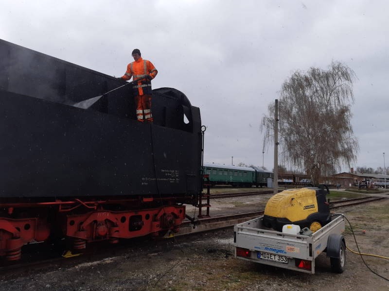 Mittels Hochdruckreiniger wurde der Tender von allen Seiten gereinigt, um ihn auf bisher verborgene Schäden untersuchen zu können. Zum Glück gab es keine entsprechenden Befunde.
