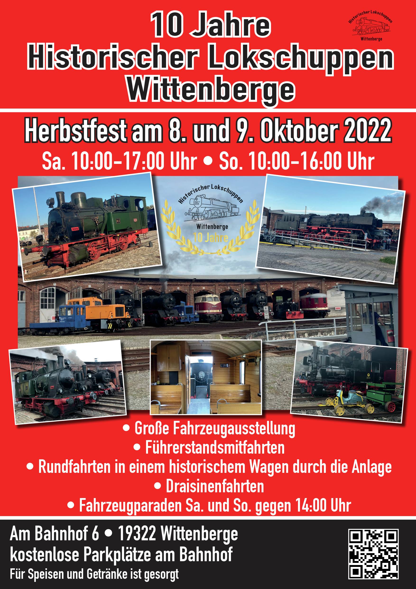Am 8. und 9. Oktober feiert der Verein sein 10-jähriges Bestehen im Historischen Lokschuppen Wittenberge. Sie können uns an den beiden Tagen zwischen 10 und 17 Uhr (samstags) bzw. 10 und 16 Uhr (sonntags) besuchen und jede Menge erleben. Es gibt eine große Fahrzeugpräsentation, Rundfahrten mit dem Museumszug, Führerstandsmitfahrten und Fahrten mit der Draisine. Es haben sich auch einige Gastfahrzeuge angemeldet. Wir werden darüber berichten, sobald die entsprechenden Zuläufe und Rückführungen der Fahrzeuge von und zu ihren üblichen Standorten gesichert sind.