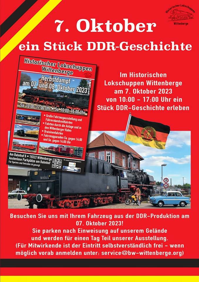 Nun nochmal zurück zum Anfangsthema, dem sich abzeichnenden Herbstdampf: Auf die Veranstaltung an sich haben wir bereits hingewiesen. Darum herum gibt es jedoch noch einige Schmankerl, die auch noch erwähnt werden wollen. Da sind zunächst die Zubringerfahrten zu unseren Dampftagen. Am Samstag, den 7.10. verkehrt ein Sondertriebwagen aus Neumünster nach Wittenberge, am Sonntag ein Schienenbus „Ferkeltaxe“ aus Neustrelitz. Es gibt noch Fahrkarten. Wenn Sie also standesgemäß mit einem dieser Züge anreisen möchten, finden Sie nähere Informationen und Buchungsmöglichkeit auf unserer Internetseite https://www.dampflok-wittenberge.de und der Internetseite der Kollegen aus Neumünster https://www.kulturlokschuppen.de . Wenn Sie am Samstag, den 7. Oktober, mit dem Auto anreisen und es aus DDR-Produktion stammt, haben Sie die Gelegenheit, damit direkt auf das Museumsgelände zu fahren und sich den Eintrittspreis zu sparen. Wir bitten allerdings um Voranmeldung per Email an service@bw-wittenberge.de .